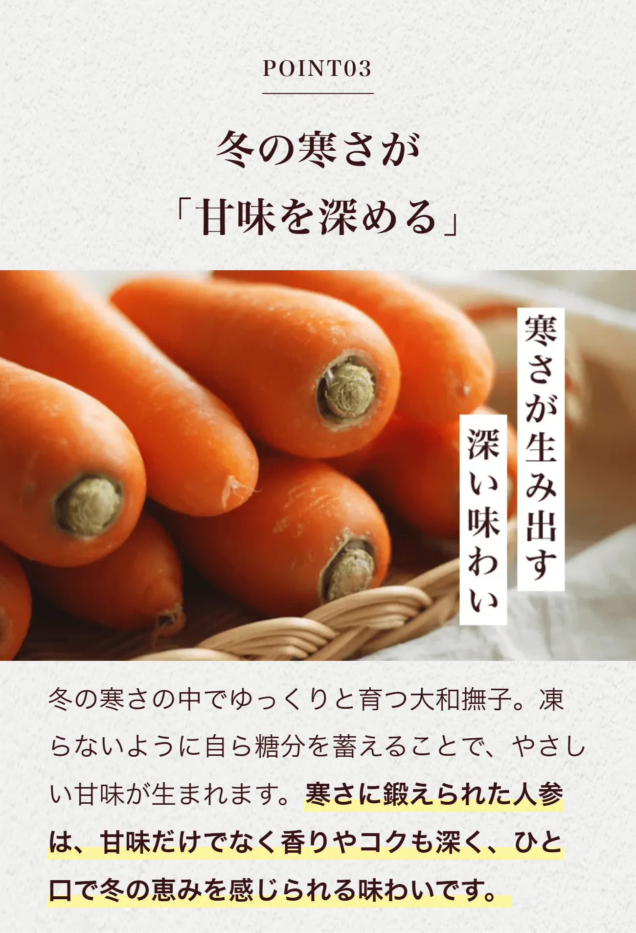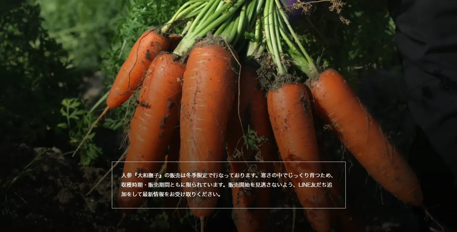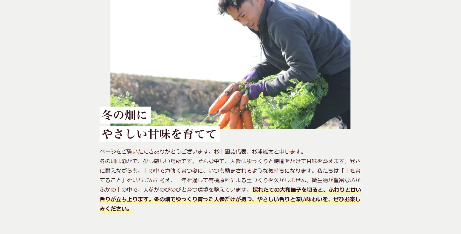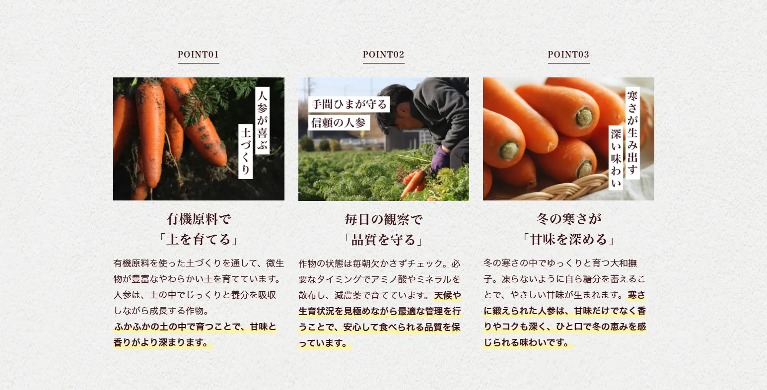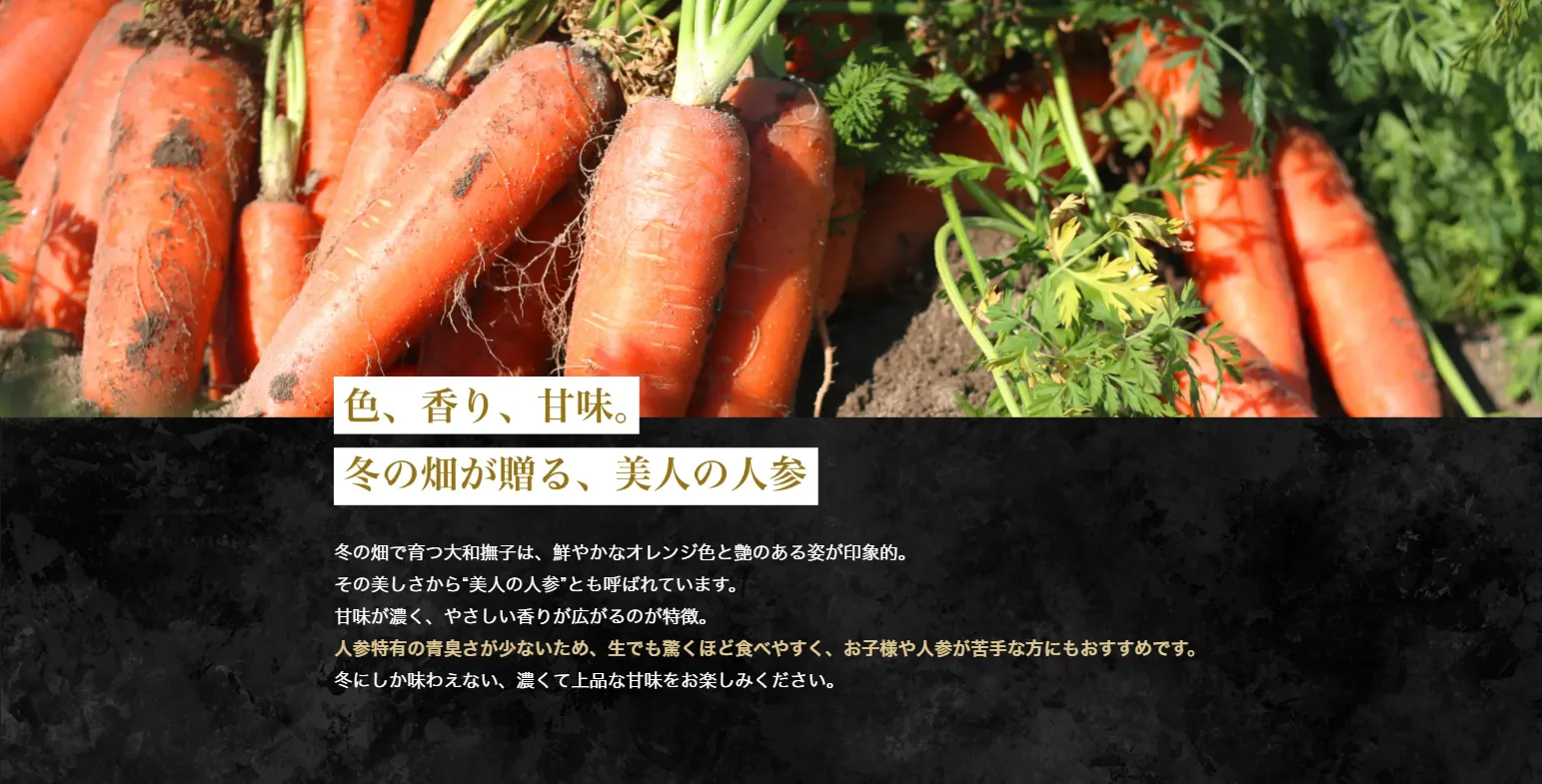 その甘さの理由は、気温の低い冬に育ち、凍らないよう人参が自らを守りながら成長するから。