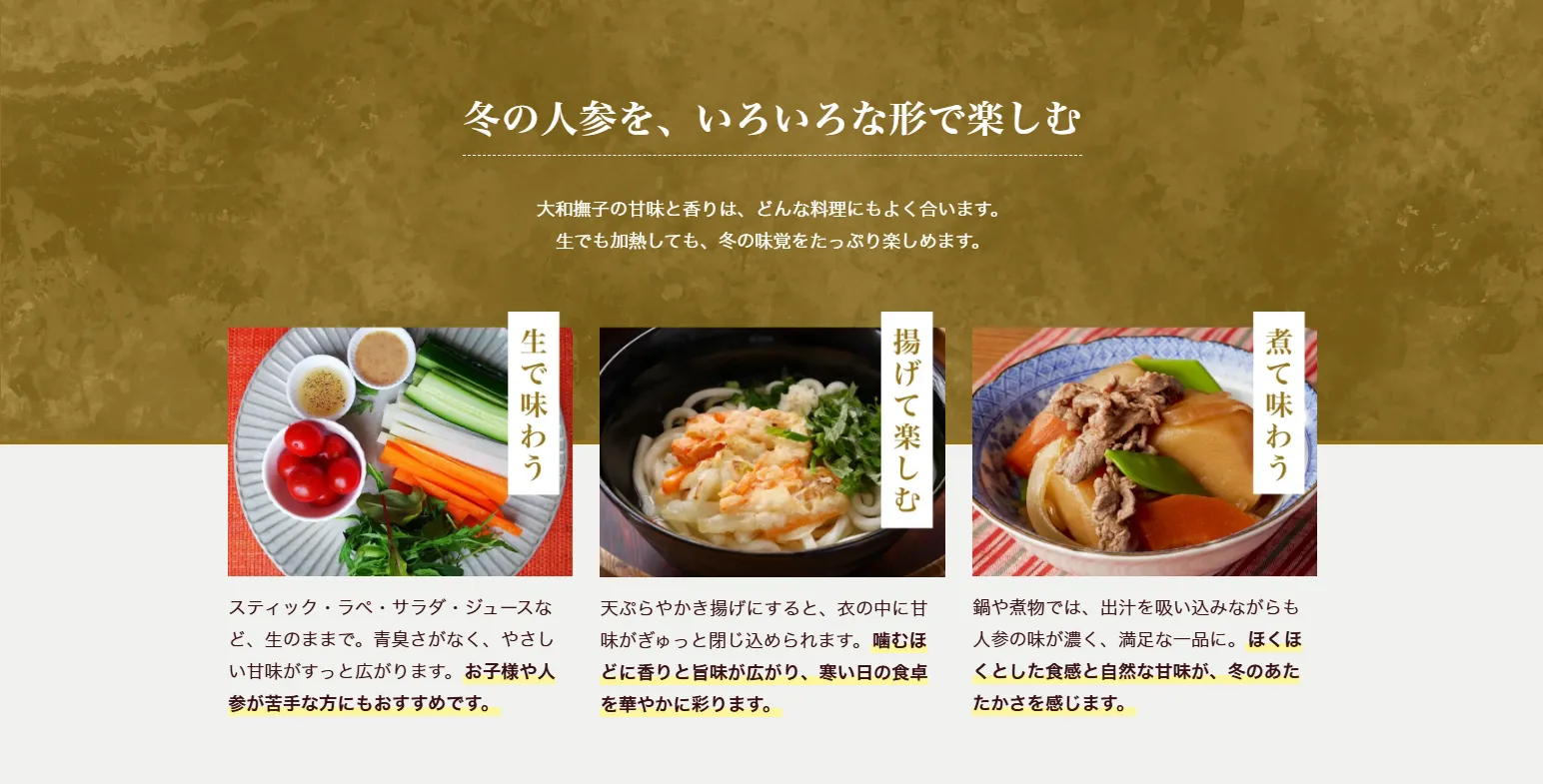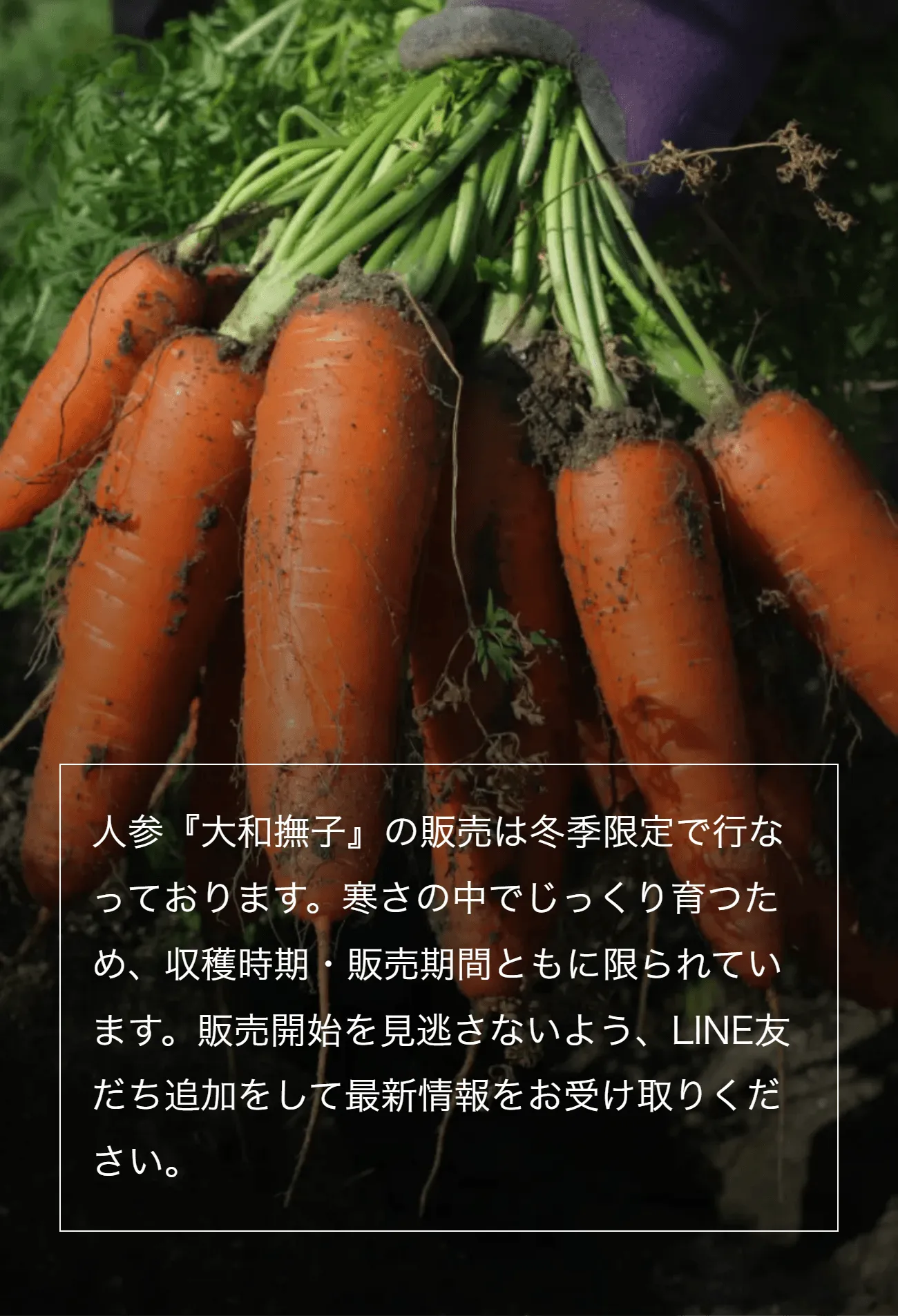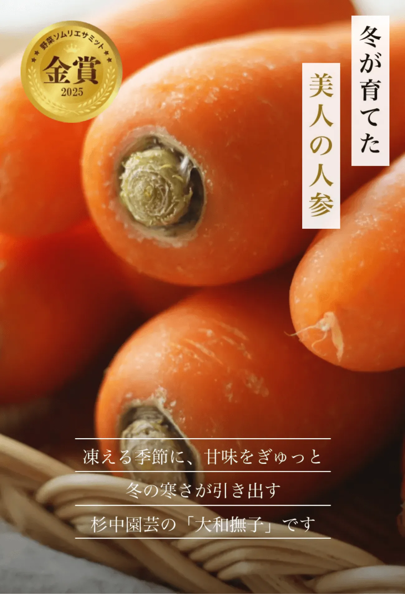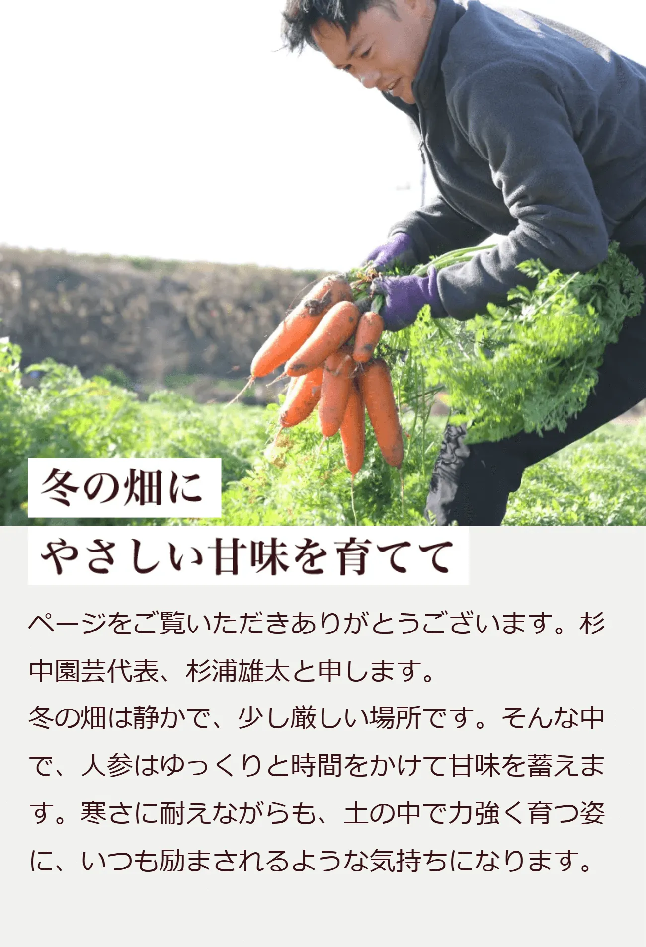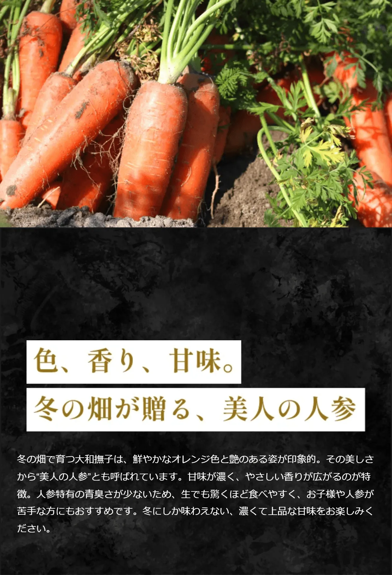 その甘さの理由は、気温の低い冬に育ち、凍らないよう人参が自らを守りながら成長するから。