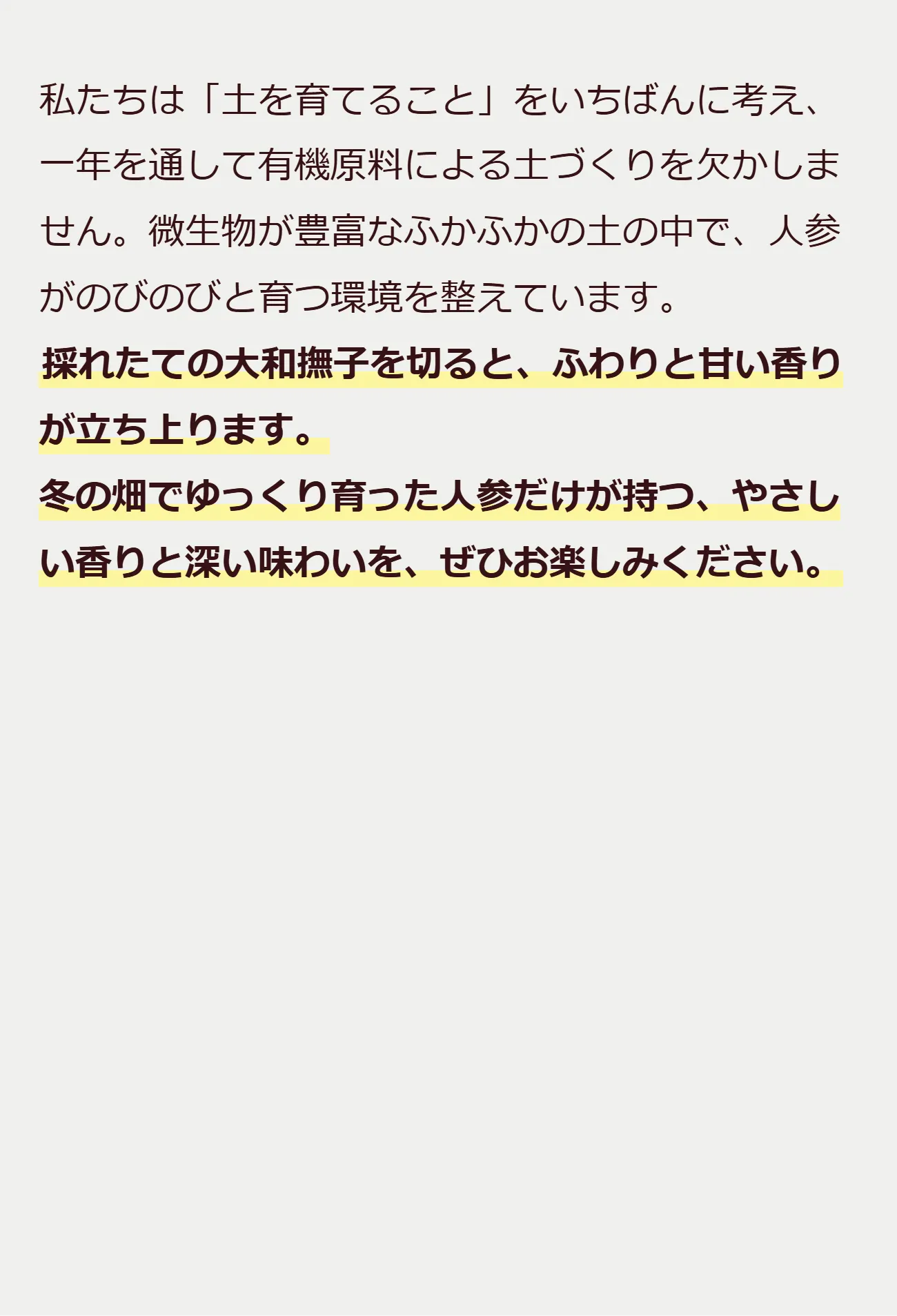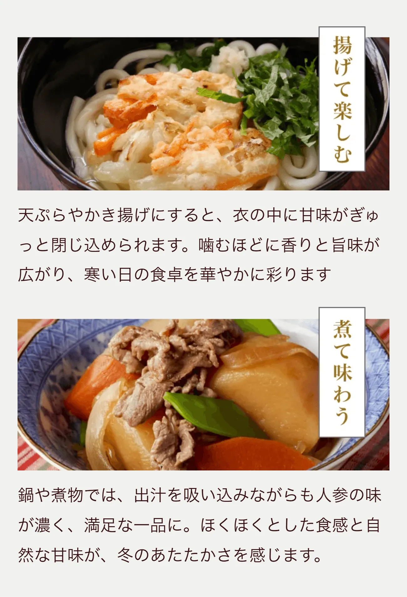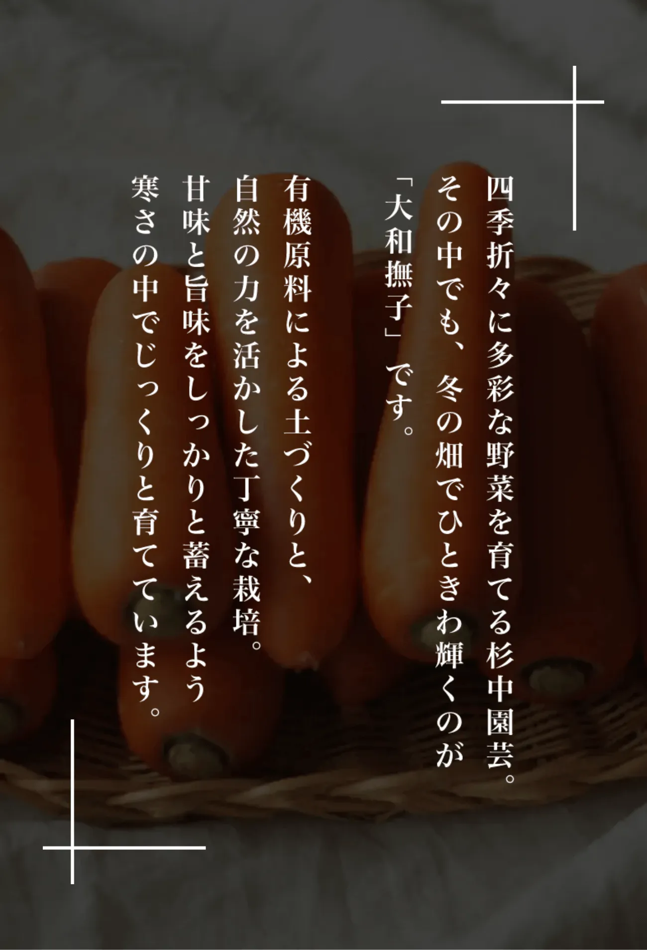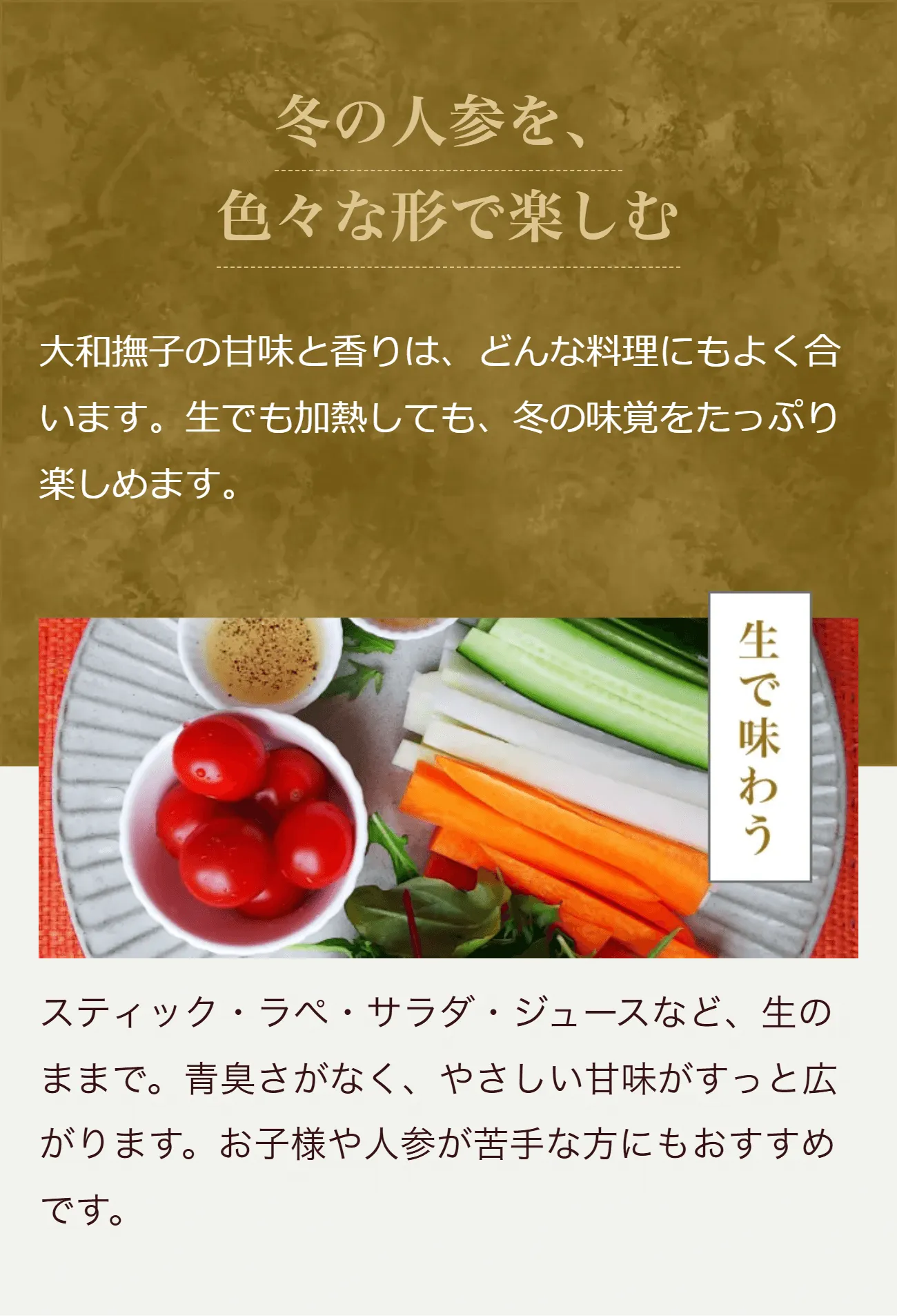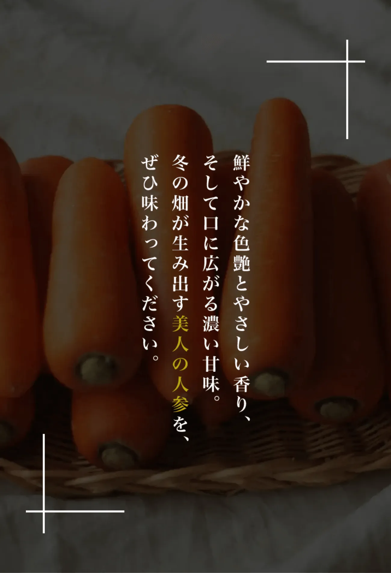 その甘さの理由は、気温の低い冬に育ち、凍らないよう人参が自らを守りながら成長するから。