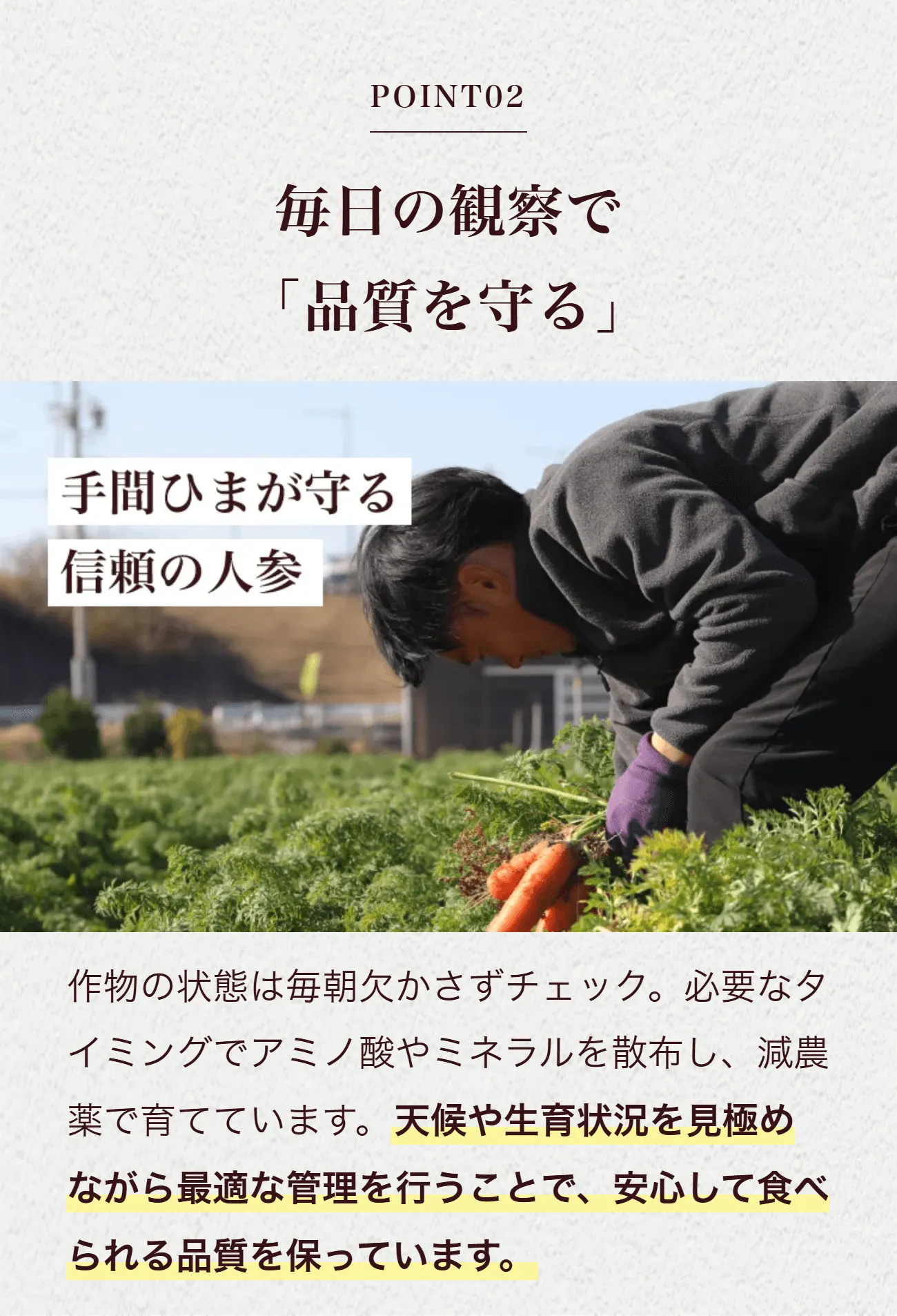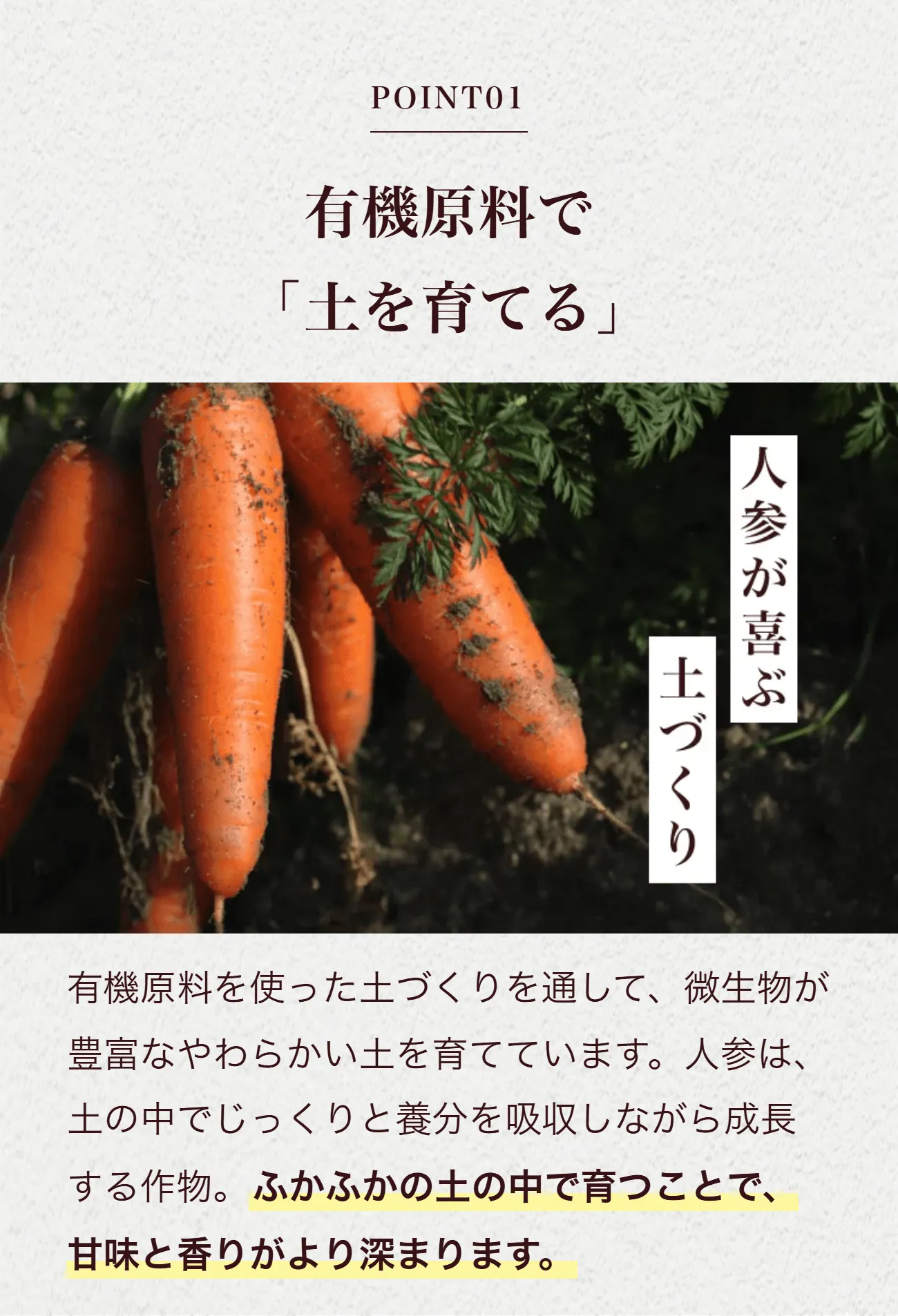 よりよい土壌とこだわりの肥料もあわさり、人参本来の甘みと旨みを引き出しています。