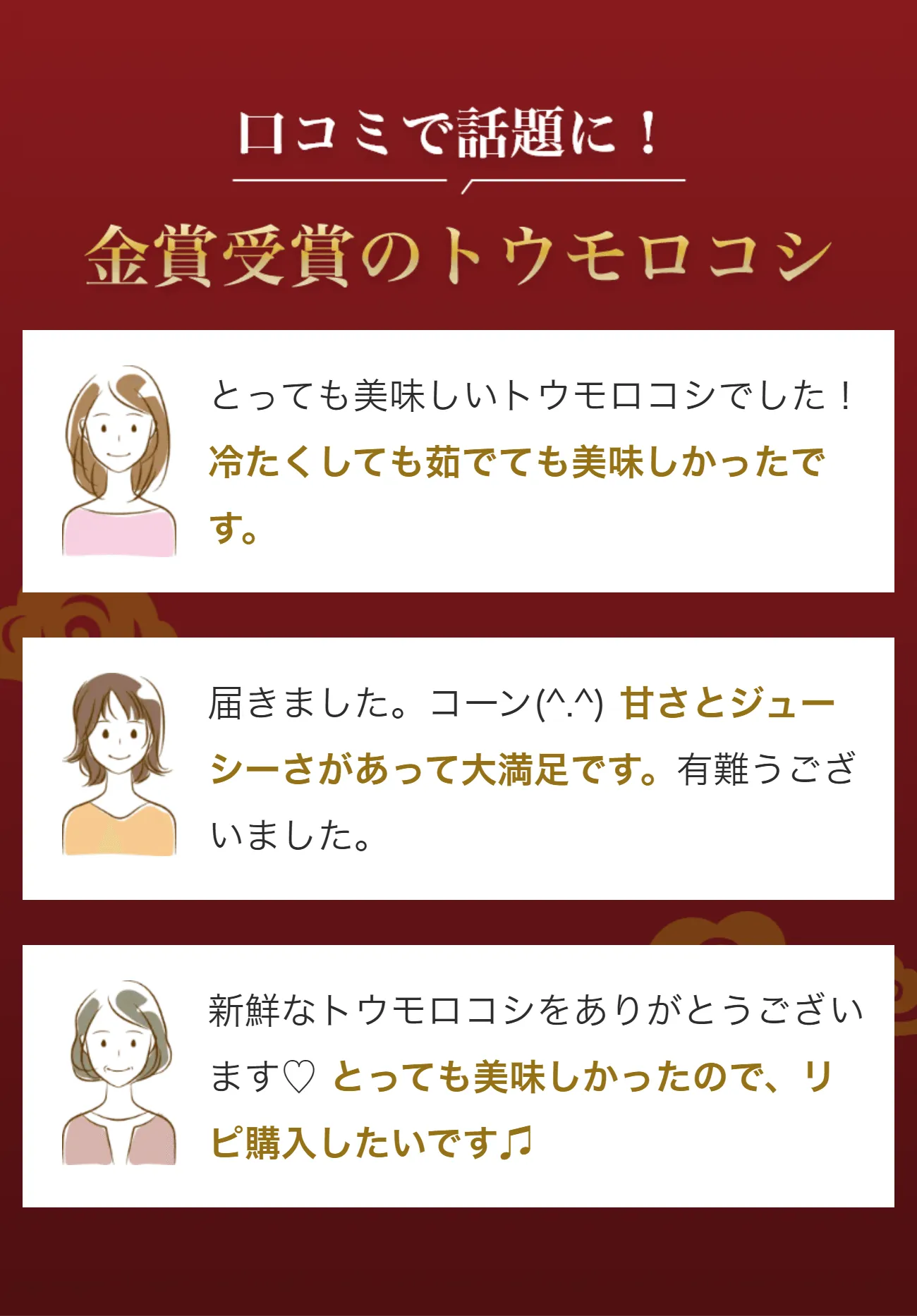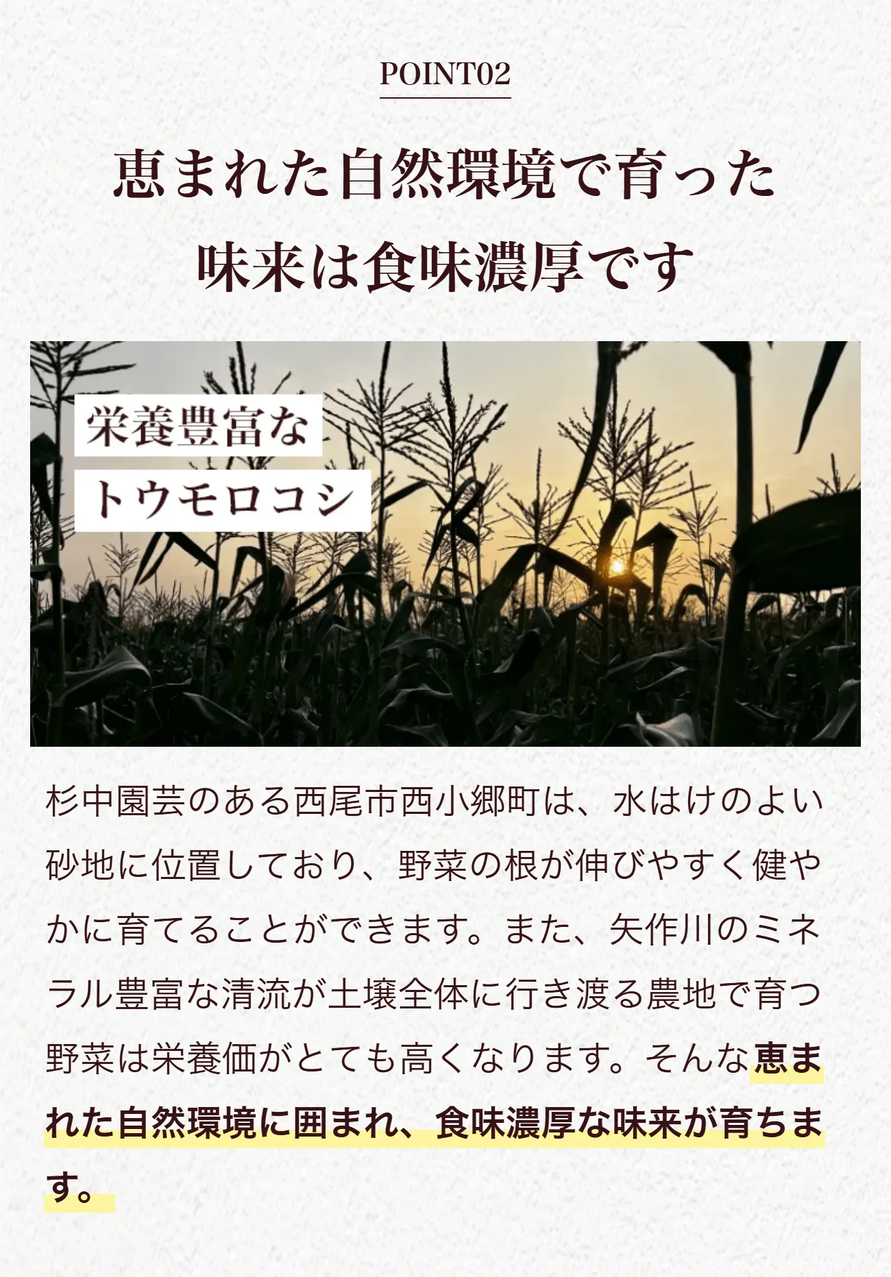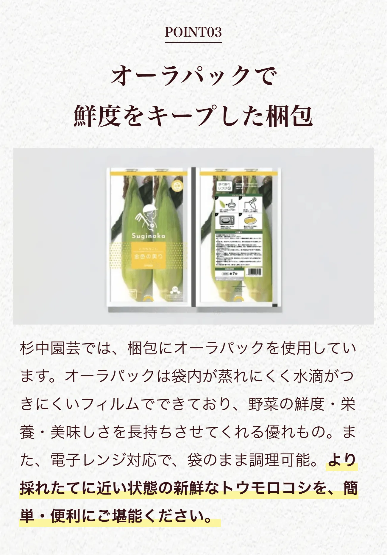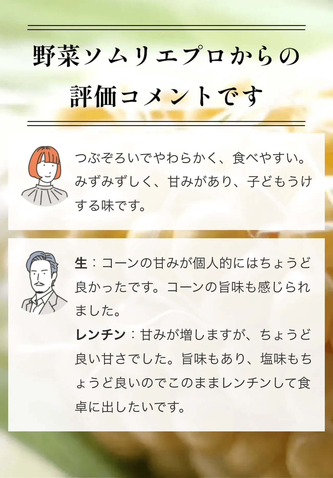 トウモロコシの純粋な旨味に、フルーツのような甘さが特徴です。